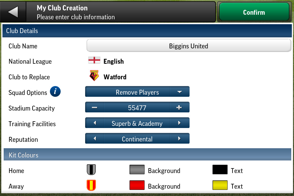 ניתן לבחור את כל הפרטים של הקבוצה - השם, צבעי התלבושות ואפילו את הרכב הסגל - תוכל ליצור סגל הבנוי מהמשפחה והחברים שלך, סגל של שחקני עבר קלאסיים וכו'.